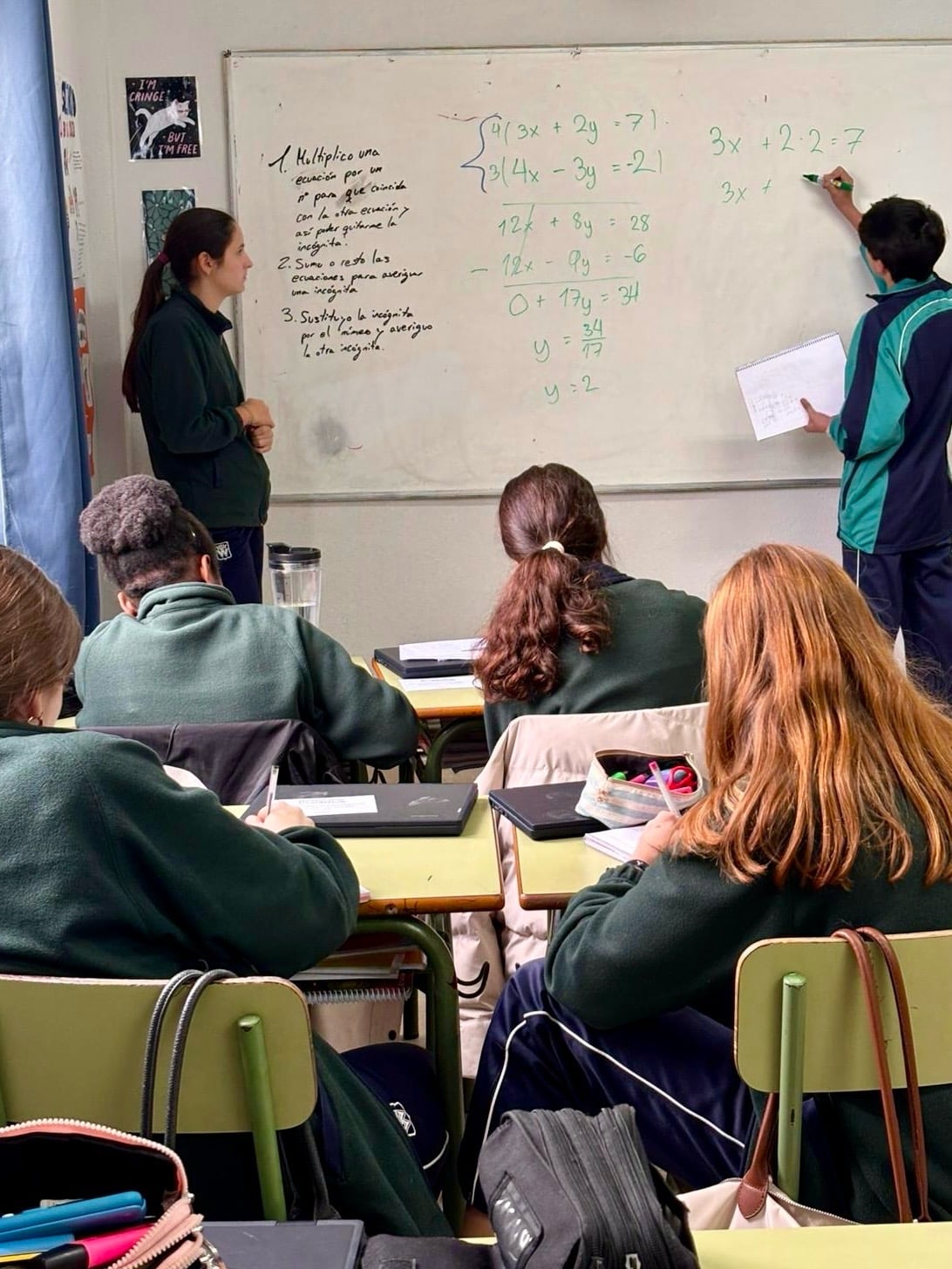 Organizados en cuatro equipos, cada grupo se ha especializado en un tipo de sistema de ecuaciones. Tras profundizar en su contenido, han asumido el papel de docentes para explicarlo al resto de la clase, desarrollando así no solo sus competencias matemáticas, sino también habilidades comunicativas y de trabajo en equipo.